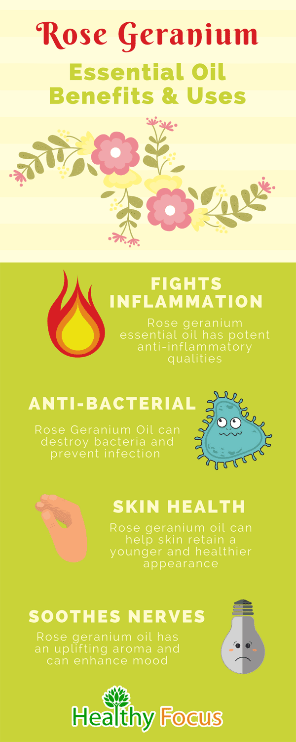 Rose geranium essential oil has potent anti-inflammatory qualities that can help with a whole host of diseases caused by inflammation.