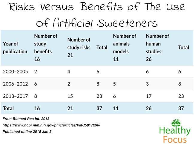 The table shows that the more recent studies from 2013-2017 have found more risks than benefits.  More recent studies also have more human studies.  More research will need to be done but right now there does not seem to be a reason to use artificial sweeteners –especially when some natural alternatives are available.