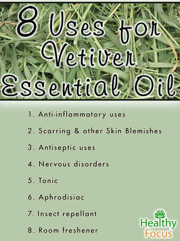 - After diluting it with a carrier oil, vetiver makes a great massage oil to help promote relaxation and circulation. Massaging it into scars and stretch marks can help with your skin’s appearance.