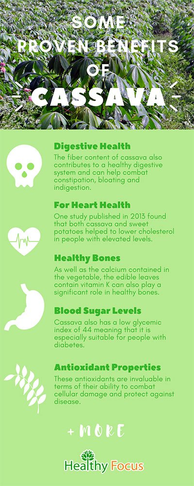Cassava is a staple food in much of the world and provides a cheap and easy source of dietary fiber and nutrition. While it is high in carbohydrates, it is nevertheless a healthy option. It can benefit your health in a number of ways including digestive health, heart health, skin health and bone health.