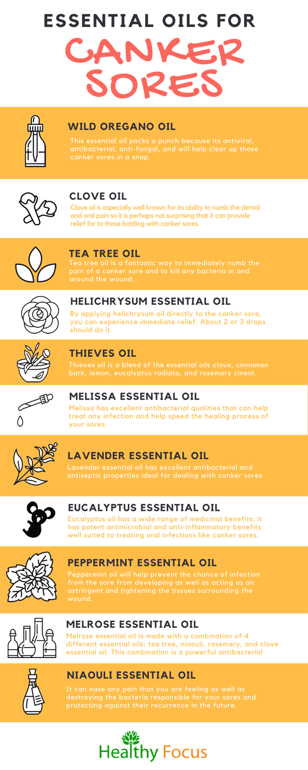 - You can apply essential oils directly to your canker sore by placing a drop on a clean finger and applying directly to the sore. Reapply 2-3 times a day until your canker sore is gone.