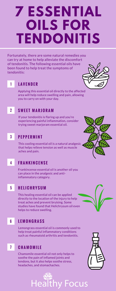 Fortunately, there are some natural remedies you can try at home to help alleviate the discomfort of tendonitis. The following essential oils have been found to help treat the symptoms of tendonitis: