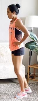 Start out the squat in a standing position with your feet at shoulder width pointing forward. Making sure that your torso is upright; lower yourself down gently by bending your knees until your thighs are parallel with your knees. Extending your arms in front of you will help you to retain your balance. Hold the position for a moment and then push back up to the standing position. Try to do 25 reps with good form and build up to 50 when you feel able.