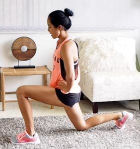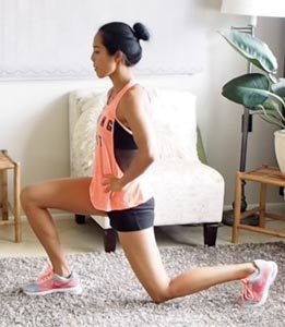 Begin the exercise in a standing position with your feet apart in line with your hips. Making sure to keep your back and head straight, bend your left knee until your thigh is parallel to the ground. Your back knee should be slightly above the ground. Bring your body back to its upright starting position by pushing off your front foot. That is one rep completed. Try doing 8 reps on each leg to begin with and build up to 12 reps when you feel that you can.