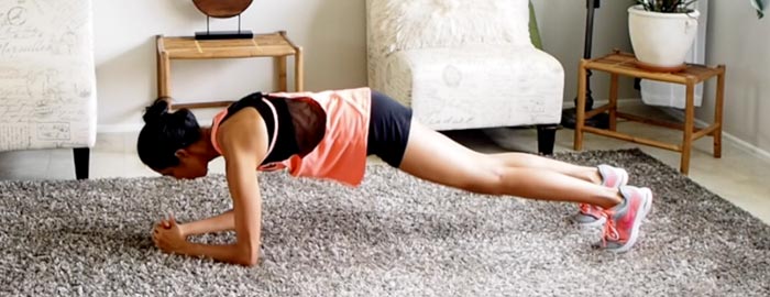 Start the exercise in a plank position with your hands directly under your chest and slightly wider than your shoulders.