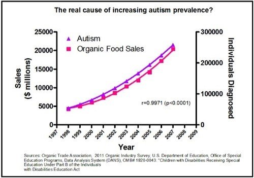 To the skeptical eye however, none of this evidence looks especially strong. The line graph presented has been the object of quite a bit of ridicule with some creative cynics uploading graphs showing a similar correlation between increasing autism rates and he sales of organic food.